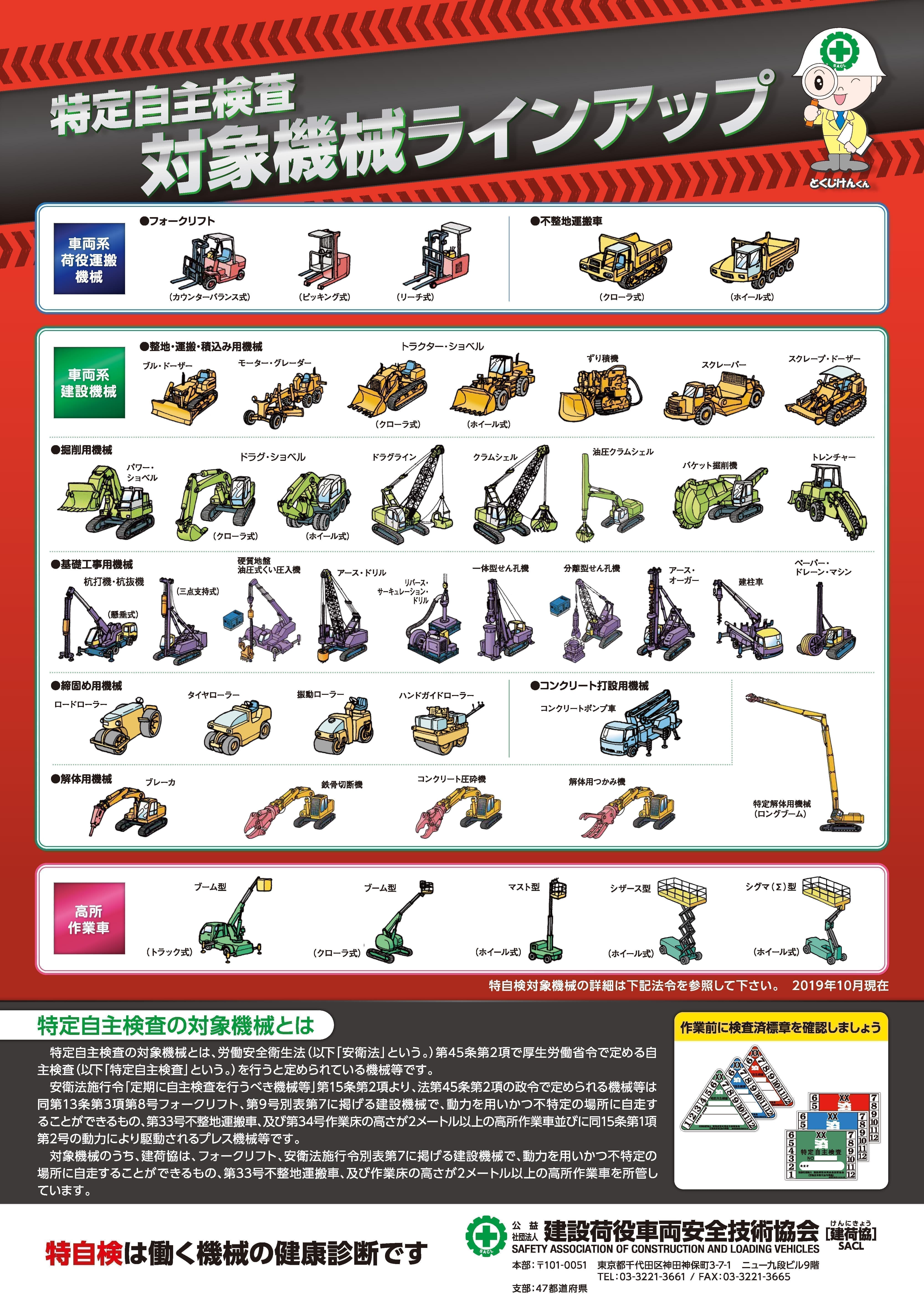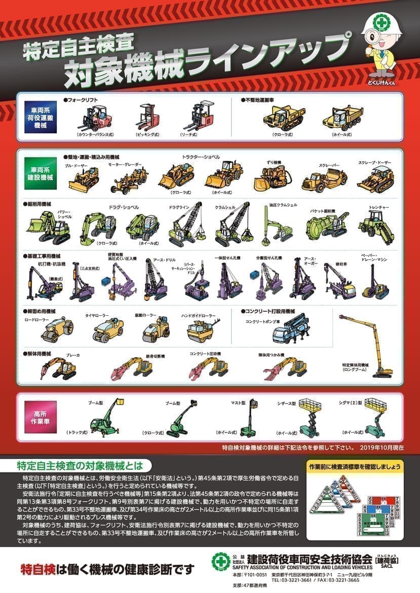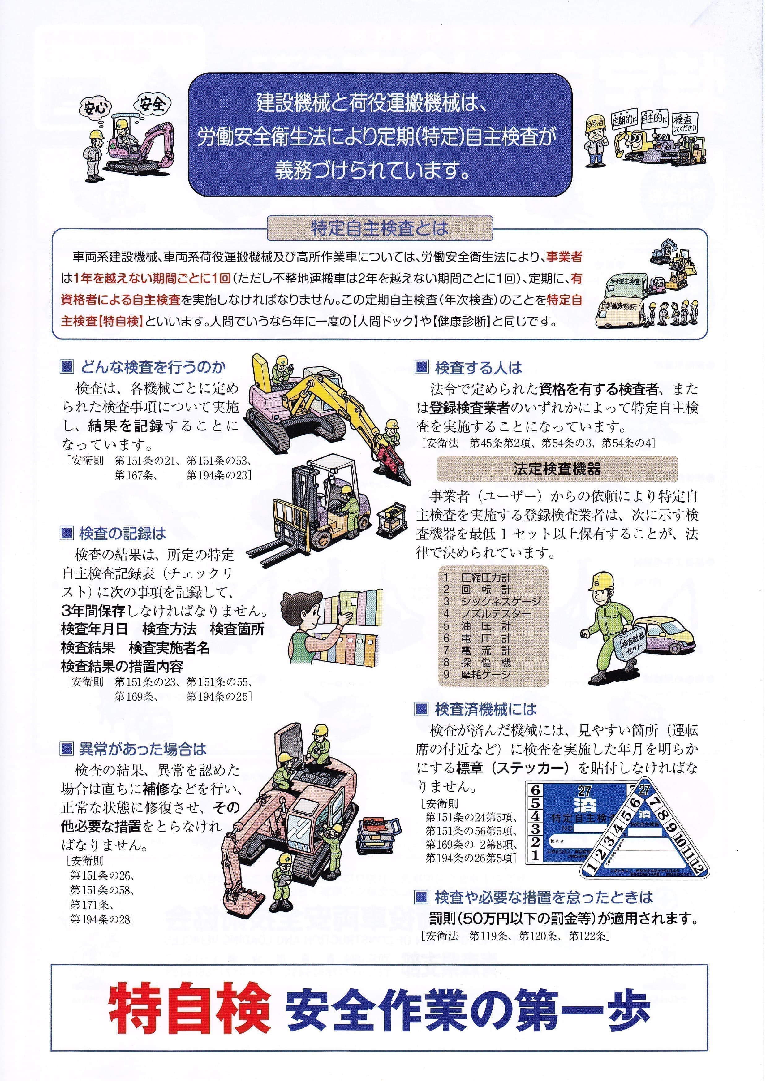 特定自主検査 車両系建設機械、車両系荷役運搬機械及び高所作業車については、労働安全衛生法により、事業者は1年以内ごとに1回、有資格者による自主検査を実施しなければなりません。